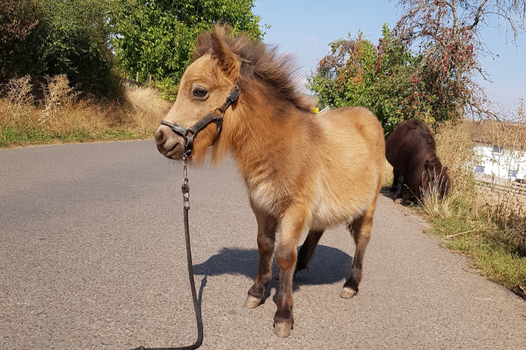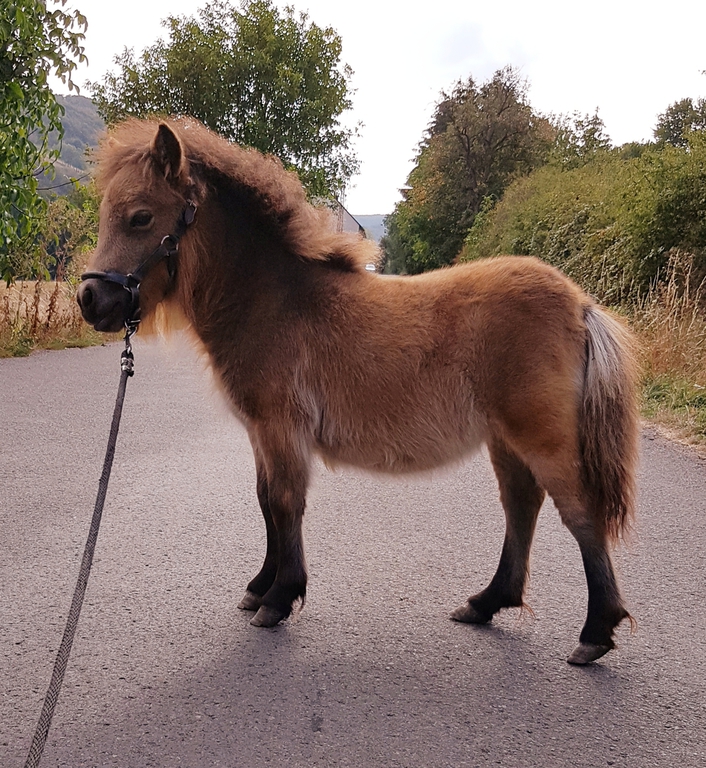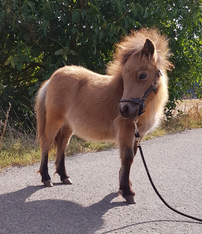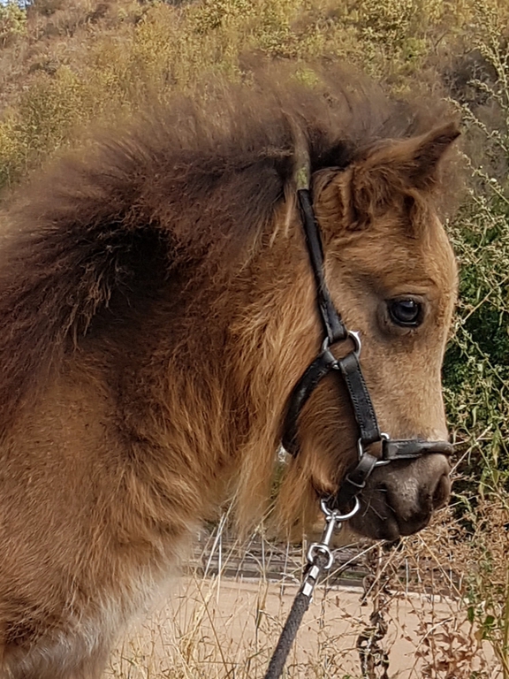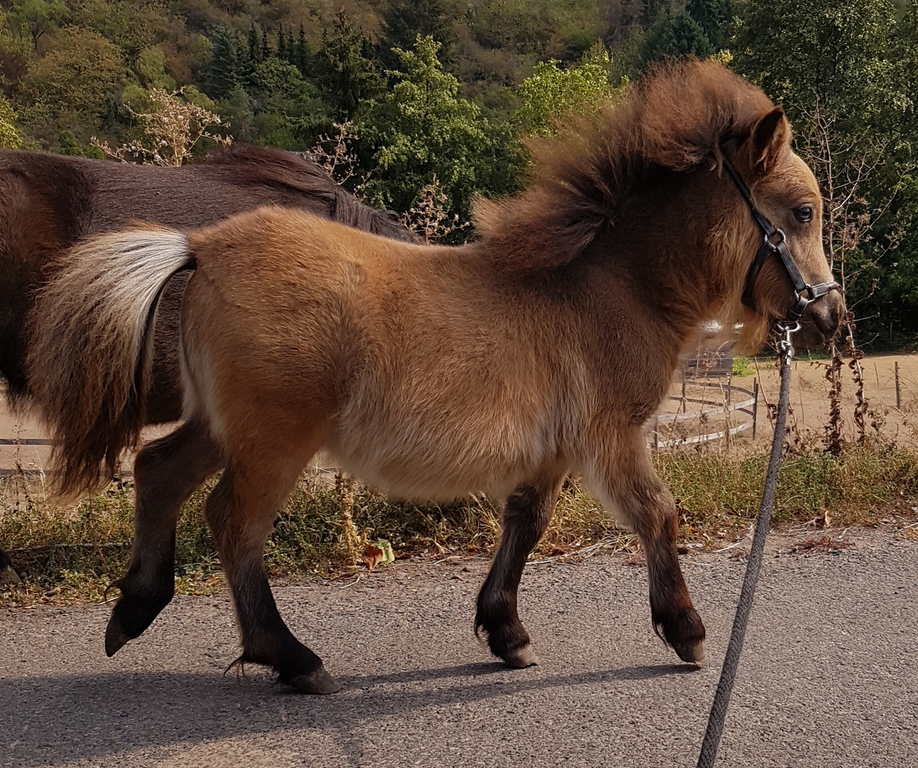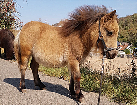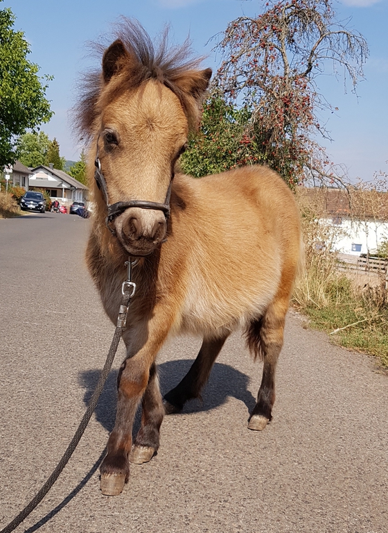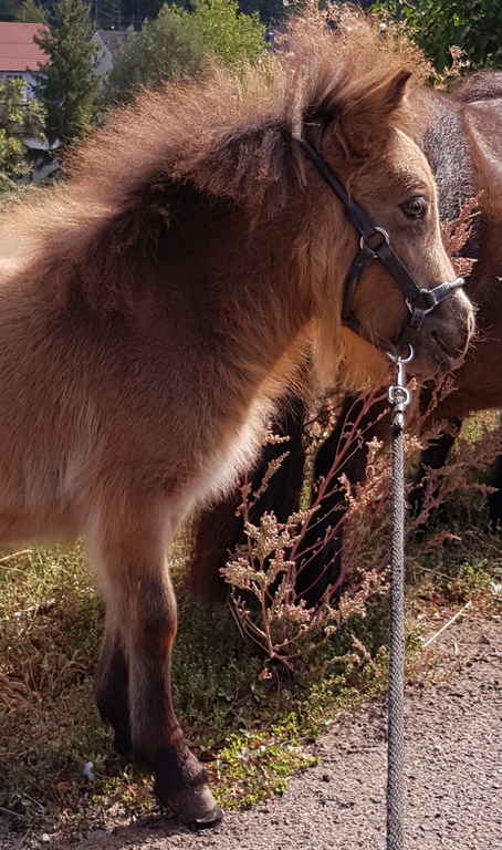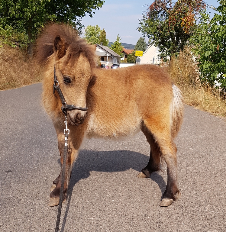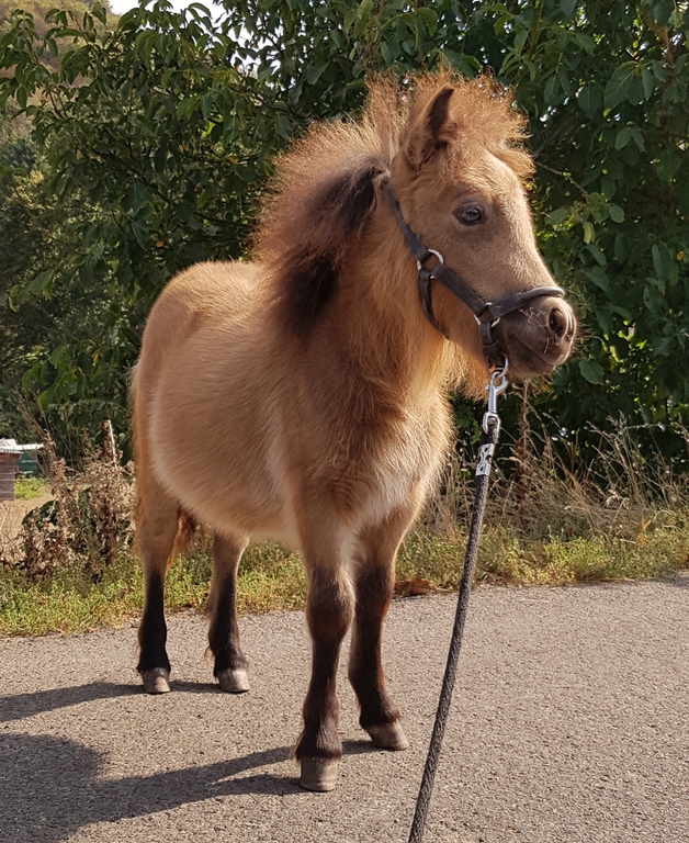 Unsere Kathinka ist eine kleine ausgeglichene Stute, im Umgang ist sie sehr gelassen und hat ein ausgeglichenes Gemüt. Sie hat grau-blaue Augen von ihrem Perlinopapa. Anzumerken ist, daß sie einen kleinen Unterbiß hat. Dies wird sie nicht beeinträchtigen und kommt bei den kleinen Ponyrassen leider mal vor. Aber wir möchten natürlich darauf hinweisen, damit zukünftige Käufer direkt Bescheid wissen.